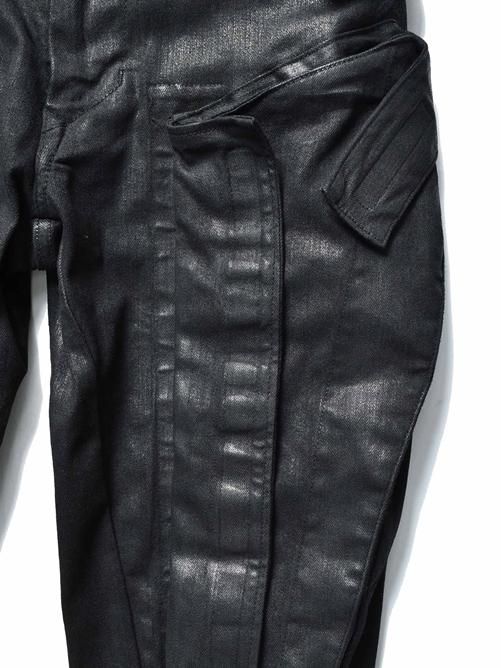 ■ 生地の表面に激しいコーティングを施すことでレザークラスの重厚感、硬質感が加わり、一般的なデニムの概念とは一線を画するモードな雰囲気を纏ったソリッドブラックが圧倒的存在感を放ちます。
