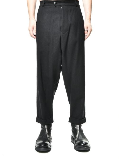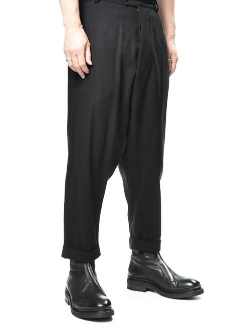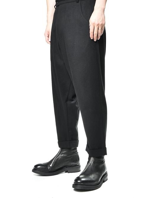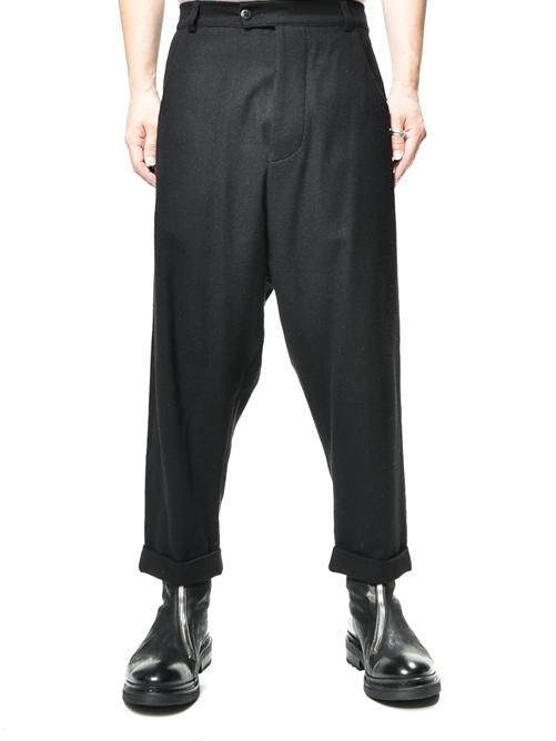 ■クロッチ系のルーズパンツといえば、カジュアルライクなデニム地やリラックス感を高めたジャージ素材のものをイメージされる方が多いと思いますが、こちらはシックな印象を与えるウールベースの素材を採用。