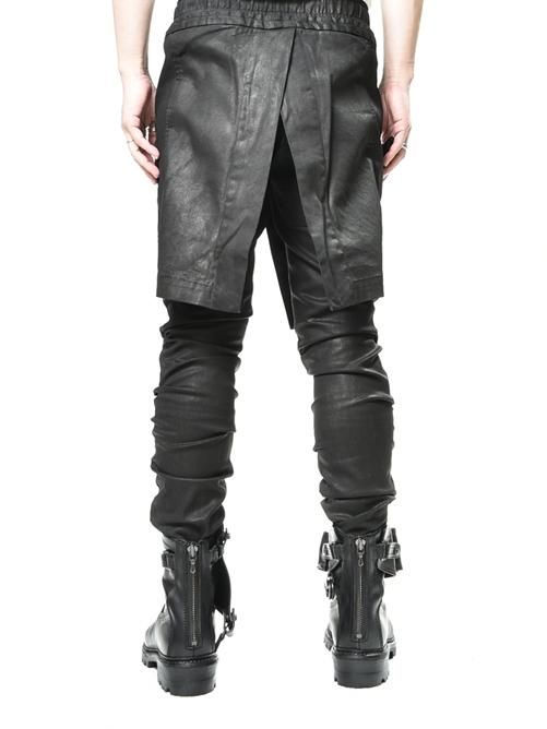 ■スキニーシルエットのパンツに、ラップ風のスカートパーツを一体化させた独創的なデザインを採用。