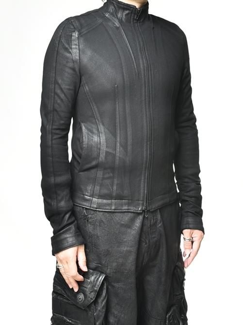 発色をまとったシームのアタリが視覚的効果を生み出し、ボトムスに同色の黒を組合わせても表情豊かな異素材感を演出。