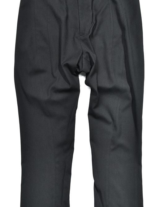 ■一見するとシンプルなトラウザースですが、独自のパターンメイキングで形作られた外側から内に入り込むシームや膝下のタマリが視覚的なインパクトを生み出します。