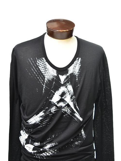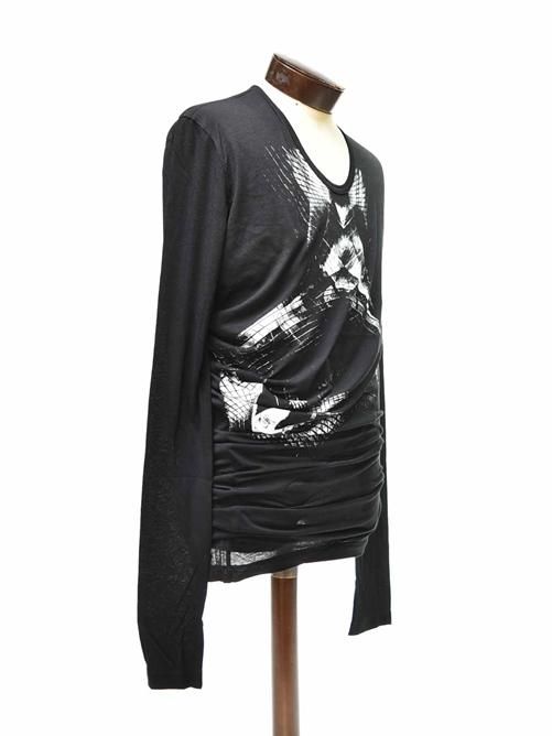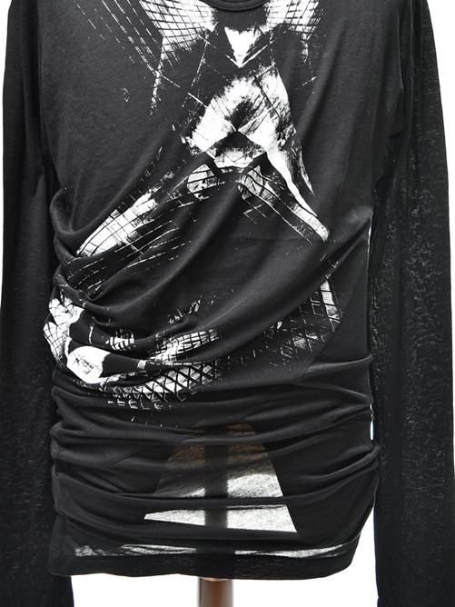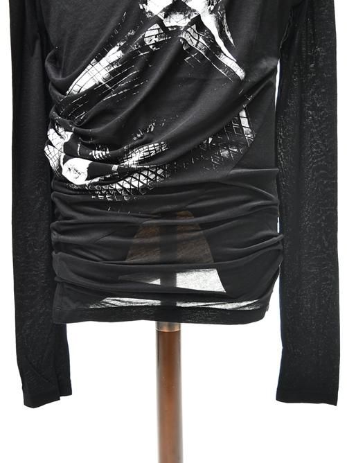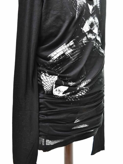■ドレーピングデザイン+グラフィックプリントという大胆なアプローチは独特な真新しさがあり、これまでのシャーリングカットソーとは一味違った印象に仕上げられています。